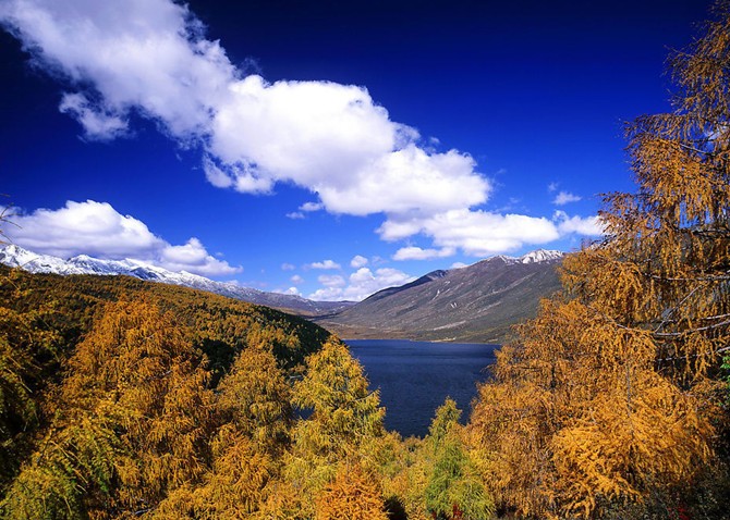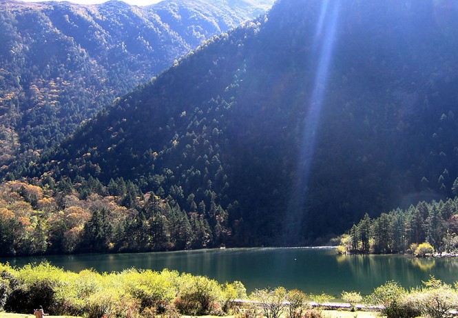 野人海——中國情海木格措漢名野人海,又名大海子,是川西北最大的高山湖泊之一。水域面積近4平方公里,水深逾70米,海拔3700米。因水源大部分來自身后女媧雪山的融化積雪水,因而能見度很高,一般為6-10米左右。木格措四周被群山、森林、草原環抱,紅海、黑海、白海等幾十個個小海子圍繞著她,猶如眾星捧月。木格措出海口左面的山峰名犀牛峰,月明星稀的夜晚,如水的月光潑灑在山峰上,那柄朝天的犀牛角會發出銀色的寒光。木格措出海口右面山上有“臥虎觀月”的景觀,真如一只臥虎望著天上,虎視眈眈地乜著犀牛峰。