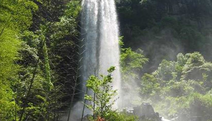 瀑布高200多米,上窄下寬,活似從天邊撒下的一具銀線網(wǎng)。是猛洞河最大的瀑布。它是一條水量豐富的小河,在此處突然失去河床的依托,水流飛奔直下,臨空跌落到底下的陡坡上,然后呈弧行展開,直飛到司河。此瀑布近觀滔滔、涸霧朦朧、凌空習(xí)墜、漫天飛珠,奔騰直下。流水傳說(shuō),這里原來(lái)沒(méi)有瀑布,只是一山石壁高聳藍(lán)天。壁下只有這具隋園形澄潭。古時(shí)候,潭中魚妖成群,作惡多端,其中一黑魚妖,每每掀翻船筏,攬人落水,以供餐食,據(jù)說(shuō)在這里翻船破筏的人落水后沒(méi)有一個(gè)人能出來(lái)。人們苦叫這里為落水坑,年復(fù)一年,人們無(wú)奈,求上天保佑,于是玉皇派觀音下塵明查,查知黑魚作祟便揮手出線,招手成網(wǎng),一句咒語(yǔ),黑魚妖落入網(wǎng)中,為了讓世人咄言黑魚,便將黑魚掛在石壁之上,遺臭萬(wàn)年。觀音走后,魚網(wǎng)變成了這個(gè)大瀑,故名落水坑瀑布。現(xiàn)遠(yuǎn)觀瀑布還可看到淹留在瀑內(nèi)的黑魚,隱隱約約在流水下閃動(dòng),那情景象是在緩緩向上游呢。