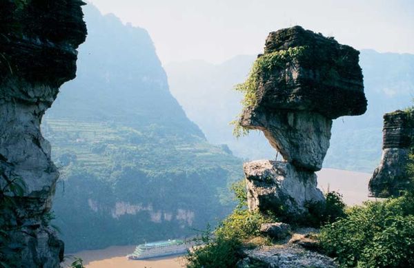 燈影石中最負盛名的是沙僧石,被譽為“萬里長江第一石”。它矗立在懸崖絕壁之巔,呈蘑菇狀,重達100余噸,底部的承重截面僅200余平方厘米,平均每平方厘米承載近半噸的重量,堪稱世界奇觀。