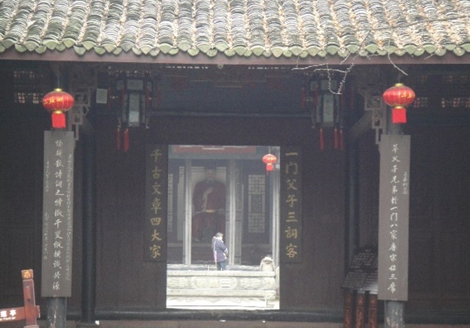 走出三蘇詞,回望門楣上的“三蘇祠”,三蘇父子,讓我深深感受著中國古老文化的內蘊。三蘇父子居功至偉,貢獻卓著,尤其是蘇軾,才華橫溢,雄視古今,可謂空前絕后。“宦跡渺難尋,只博得三杰一門,前無古,后無今,器識文章浩若江河行大地;天心原有屬,任憑他千磨萬煉,揚不清,沉不濁,父子兄弟依然風雨共名山。”