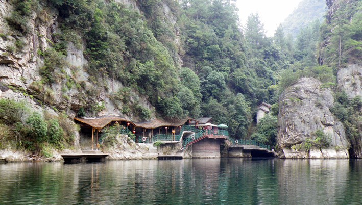 湖中有兩座疊翠小島,近岸奇峰屹立,峰回水轉。泛舟漫游,只見一湖綠水半湖倒影,充滿詩情畫意。“云梯萬丈上天臺,高峽平湖一鑒開,王母瑤池金扶,浣沙仙女下凡來”游寶峰湖,你就會欣賞到這樣的詩情畫意。群峰擁抱的寶峰湖,長約2.,5公里,湖猶如一面寶鏡,四面青山,一泓碧水,蕩槳溫游,格外愜意。坐在船上,環顧四周,千山聳翠,俯視水中,倒影慢移,碧水照相館得群峰綠,人面桃花水映紅。真是靜極了,美極了!韓劇《九天洞》拍攝的湖水就是寶峰湖。