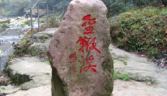 4、醉羅漢:與金鞭巖隔溪對峙,矗立在斜坡上,高200余米。 上下一般粗壯,峰體渾圓,色赤,整座石峰向金鞭溪呈70度傾斜,形似一醉酒羅漢,欲倒不倒,似醉非醉,詼諧幽默,發人情趣。自峰下向上仰望,但覺云移峰晃,感覺隨時都要崩塌之感。 清嘉慶年間學士彭之 臣在峰壁書寫一“忠”字。清道光四年(1824),貢生彭之運作《壁忠記》一文以彰其勝。風雨滄桑,“忠”字因山石崩塌遭毀。