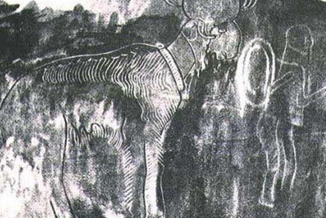 在盧山巖畫中,形象最多最集中的為一號(hào)巖畫,巖面面積約20米見方,其上有150多個(gè)形象。使人們頗感興趣的是車獵和生殖圖。車獵為雙轅位馬,人立車上,引弓如月。箭射向車后的野牛。為了形象地表達(dá)射獵的意圖,制作者將箭矢飛行的弧線也打鑿出來。這幅圖打制精細(xì),形象準(zhǔn)確。畫面雖然有些漫漶不清,但其繪制意圖卻依然可以看得清楚。畫面一男一女。女的正面,雙腿微曲向兩邊分開。在兩腿之間、臀部下面,打鑿出一直徑約3厘米的圓點(diǎn),以象征女性生殖器;男的在女的左面,從側(cè)面繪制,生殖器很突出。緊接著男女圖的下面,有一條打制得很規(guī)范的曲線,兩邊分布有許多圓點(diǎn)。由于對(duì)男女生殖器的強(qiáng)調(diào),故其交媾場面不易直接表現(xiàn),而采用象征性的符號(hào)(圓代表女性,曲線代表男性)的集合來表示。這種用符號(hào)來表現(xiàn)交媾的思維方式,在中國其它地方如內(nèi)蒙陰山也有發(fā)現(xiàn),即巖畫界所謂的“蹄印”或“漥穴”。這幅畫的意義在于使人們對(duì)吐蕃的某些文化觀念和觀念的表達(dá)方式有所了解。這里的交媾,無疑帶有刺激牲畜生產(chǎn)的巫術(shù)意義;而符號(hào)象征的表現(xiàn)方式,則使我們對(duì)如何理解所有巖畫形象有所啟示。如牛的制作者想表達(dá)的未必是牛的本身。或許借牛的形象來表達(dá)牛之外的抽象概念。人們在這幅畫中已經(jīng)看到,制作者借“有形”的交媾,來表達(dá)“無形”的生殖概念。