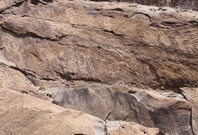 動物圖形構圖粗獷,形象生動,栩栩如生。有奔跑的鹿,有雙角突出的巖羊,有飛馳的駿馬,有搖尾巴的狗,有飛鳥的圖形和猛獸的形象,有部分人的手和太陽的畫面,還有原始宗教活動的場面。