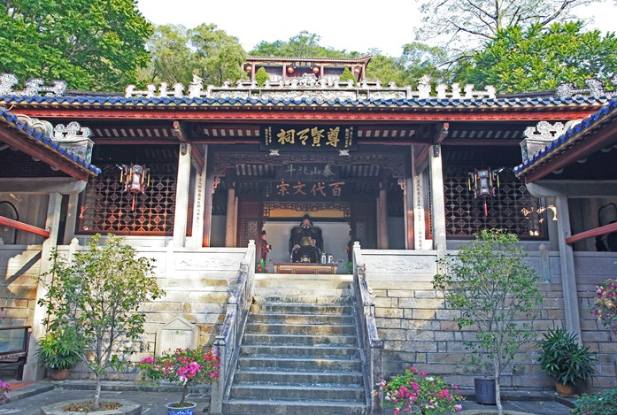 祠堂前廣場有一座古書形的石雕,上面刻寫了韓文公在《進學解》中的兩句名言:“業精于勤荒于嬉,行成于思毀于隨。”意思是說:勤奮是事業精進的前提,深思是行為成功的保證。韓祠正門,上面寫著“韓文公祠”四字,是1984年胡耀邦總書記視察潮州所留下的手跡。韓祠依山而建,層次分明,前落是韓祠的主體,后落是侍郎閣,現在我們拾級而上,石階一共有51級,是紀念韓愈51歲時到潮州。