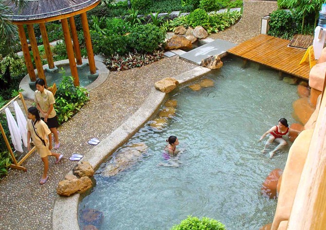 依山而建的古兜溫泉,集山、泉、湖、海為一體,風景優美,有著豐富的溫泉資源,在古兜山下新近落成的溫泉谷,格調高雅,打造出一個不同凡響的溫泉王國。溫泉谷中間有一條約150米長的人工鵝卵石河道,它不僅為景區增添了春山幽谷的野趣,更和中央水區的大舞臺及各大小泡池相連,將谷內建筑群落自然分成了三大區域:北邊是歐式風格的“羅馬殿”,東邊則是日本和式風格的“東瀛閣”,南邊是“唐宮”。