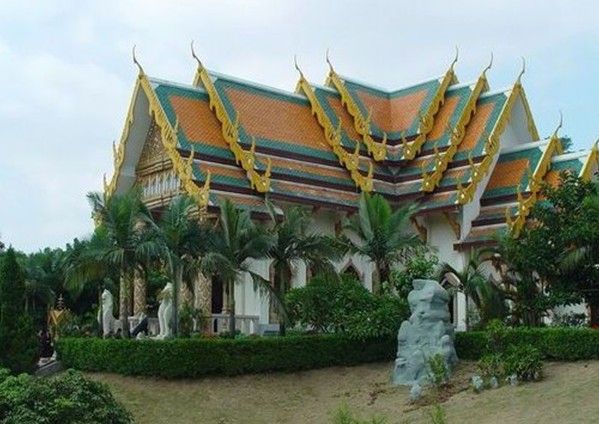 大殿總高19米,建筑面積490平方米。墻為白色,屋角、窗頂尖形,瓦似魚鱗并染青或黃色,屋檐頂端配有一支支向天的黃色裝飾圖案,新穎壯觀。內(nèi)部布置莊嚴(yán),有精美的壁畫《佛陀的故事》,但沒有中國(guó)通常的三如來(lái)或西方三圣,僅有一尊泰式跏跌坐式大型銅鑄佛陀圣像,連同蓮座高3米余,重1.5噸,金光閃閃,妙相莊嚴(yán)。東殿供奉一尊護(hù)法尊者(即四面佛)像。這位護(hù)法神,即是大梵天,本是婆羅門教,印度教的創(chuàng)造之神。