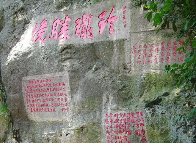 盧陵王一乾的"玉柱天關"大字,正楷,陰刻,字大見方;還有"天風海濤"、"觀海"(此石已毀)等石刻。諸家書法遒勁秀拔,各具一格,在書法藝術研究上有一定價值。
