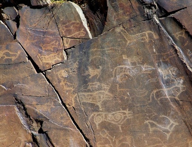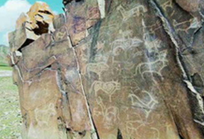 北側(cè)一處約9平方米的石塊上刻有50多個動物畫像,有牛,馬,山羊,野豬,狐貍,部分動物身上還刻有“萬”、“母”等不同形狀的紋飾,畫面形態(tài)大小不一,最長的約0.30米,高約0.20米,最小的動物長0.05米。版權(quán)所有山東聊城聊之旅國際旅行社有限公司,轉(zhuǎn)載必究!畫面形象生動,動物具有動感;在中間的一處位于第一處之南側(cè),面積約7平方米,刻有7個動物畫像,為牛羊,驢,老虎,狐貍,一般長約0.06米-0.25米,高約0.05米-0.15米;一處在最南側(cè),面積僅3平方米,21個動物畫像,以駱駝為,頭向一致,展示駱駝在沙漠里運行的場面,此外尚有馬、牛、山羊、大頭羊、蛇等。