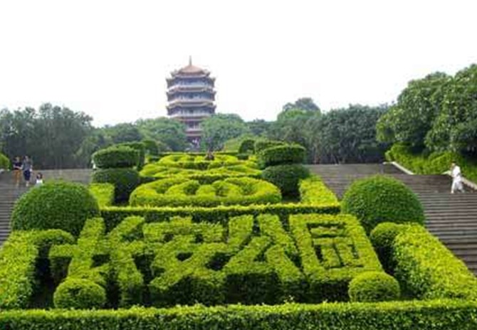 公園入口處的大門樓高14.88米,寬28.5米。正中掛著一塊匾額,上題“長治久安”,體現了人民群眾安居樂業的愿望。山頂閣樓有5層共36.5米高,采用滿洲窗,天花彩繪,與大門樓風格統一,頗具氣勢。其他建筑或依水而筑,或掩映在山林之間,體現出嶺南園林建筑輕巧通透的特點。
