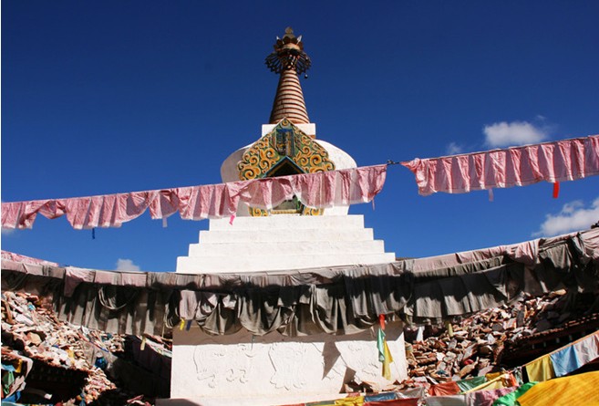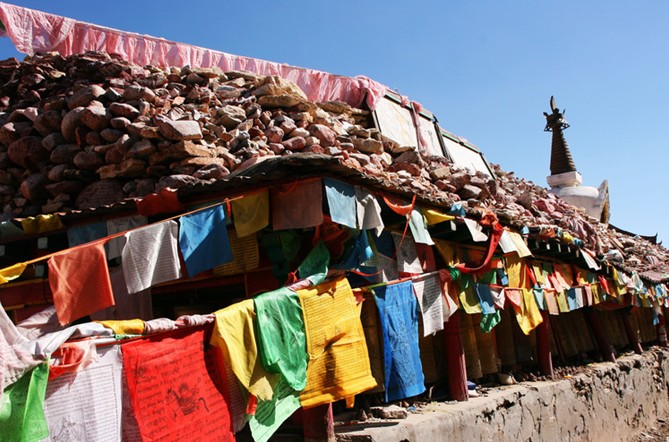 在青海省玉樹藏族自治州政府所在地結古鎮,乘上3路公交車,大約20分鐘就到了新寨村,這里有世界上最大的瑪尼堆——新寨瑪尼城。新寨瑪尼城建于公元1715年,奠基人為第一世加納活佛宗求帕文,所以也稱為“加納瑪尼堆”?,斈岫言诓卣Z中稱“多崩”,意為“十萬經石”的意思。占地有兩個足球場大小的新寨瑪尼城,版權所有山東聊城聊之旅國際旅行社有限公司,轉載必究!南部是新寨寺,其他各個方向均用瑪尼石堆砌成墻,在高高的圍墻高處還布滿了隨風飄舞的經幡。
