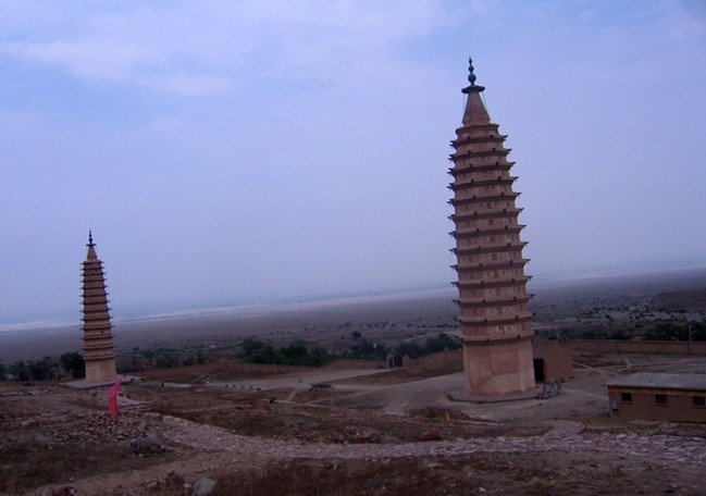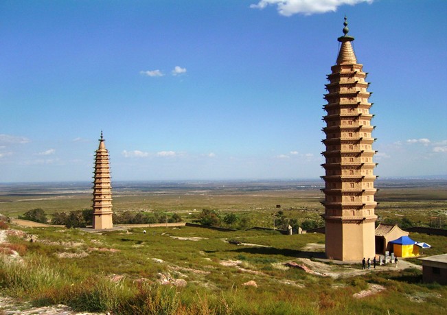 拜寺口是賀蘭山著名山口之一,這里山大溝深,環境幽靜,面東開口,視野開闊。在山口平緩的坡地上有大片建筑遺址。據考證,這里曾是西夏佛祖寺院所在地。雙塔就建在溝口北邊寺院遺址的臺地上。雙塔東西對峙,相距約百米,皆為八面十三層樓閣式磚塔。兩塔直起平地,沒有基座,底層較高,平素無飾,正南辟券門,可進入厚壁空心筒狀塔室。