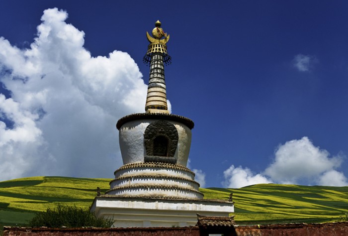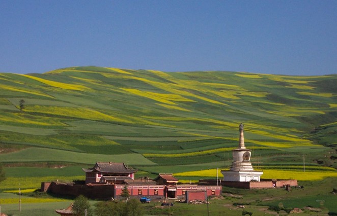 佑寧寺的建筑風(fēng)格融合了土族、藏族、蒙古族和漢族的藝術(shù),寺中的雕塑與繪畫藝術(shù)的價值很高。再加上學(xué)風(fēng)濃厚,三世章嘉•若貝多杰活佛,三世土觀•羅桑吉尼瑪活佛,三世松巴•益希班覺活佛都是著名的學(xué)者,可謂名僧輩出。了解了佑寧寺的滄桑歷史之后,就讓筆者帶座深山古寺去一探究竟吧。經(jīng)過數(shù)十公里崎嶇山路的顛跛,想必性急的您—定已經(jīng)有種急于朝拜圣地的沖動了吧。依山傍水的佑寧寺雖然經(jīng)歷了戰(zhàn)火的無情摧殘,但數(shù)百年的歲月已經(jīng)把當(dāng)年的硝煙沖刷得一干二凈,寺院與山體層疊交錯,渾然一體。寺前的白塔在山間嫩黃的油菜花的襯托下顯得無比雄武,古樹、佛殿交相呼應(yīng),更顯寺院的威武莊嚴。這里最佳的旅游季下是每年的農(nóng)歷正月、四月、六月及臘月。版權(quán)所有山東聊城聊之旅國際旅行社有限公司,轉(zhuǎn)載必究!因為屆時寺院將舉行較大規(guī)模的法會,熱鬧非凡。由于身處土族聚居的互助縣,這里的僧侶幾乎全部是土族,對于篤信喇嘛教的土族來說,到寺院”經(jīng)聽法是新年里一等一的大事。每年的正月初二,寺山將舉行為期十五天的祈愿法會。