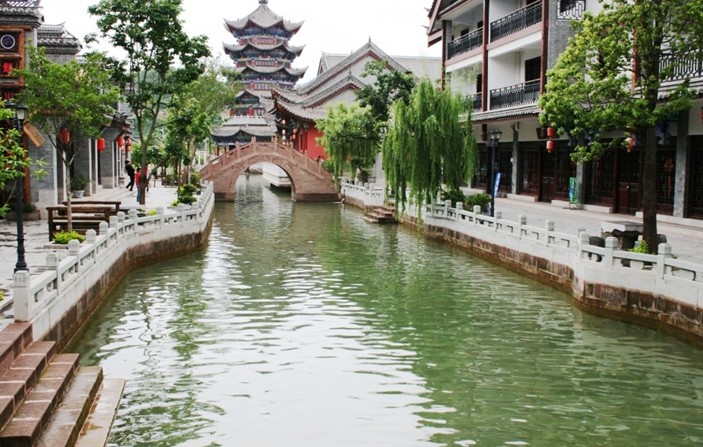 ⒐清明河:河寬8-12米,可劃船,水較深流速較慢,主要展現江南水鄉風韻。