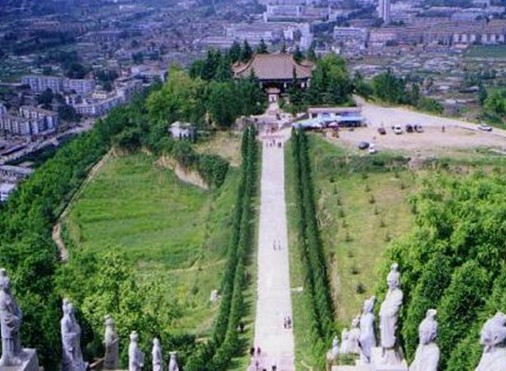 穿過祭祀?yún)^(qū),便進入墓冢區(qū)。沿著長長的陵道拾級而上,兩邊塑立著百代帝王石像,總共16位,依歷史順序依次排列為:堯、舜、禹、啟、夏桀、成湯、盤庚、紂王、周文王、周武王、周幽王、周平王、鄭莊公、齊桓公、秦穆公、宋襄公等。