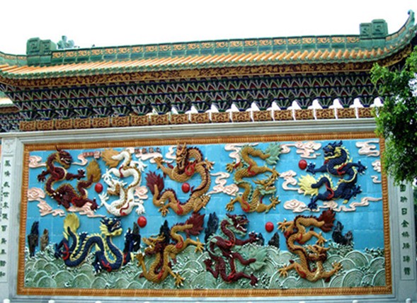 進(jìn)入南粵苑大門,迎面是一幅大型的照壁——九龍壁,這是“龍翔鳳翥”美景。九龍壁下有雕花青石底座,上有“玉包金”琉璃瓦蓋頂,四周是白玉石欄河。九龍壁有著王者氣派,顯示中華民族龍的文化源遠(yuǎn)流長。為了突出龍的形象,制作者采用浮雕技術(shù)塑造燒制,很有立體感。在海水、祥云的映襯下,九條分別為黃色、紅色、紫色、白色、藍(lán)色的巨龍,喜戲龍珠,形態(tài)生動(dòng),翻騰自如,有如遨游滄海,又似騰飛九霄。特別是在陽光照射下,熠熠生輝,色彩斑斕,華美亮麗。