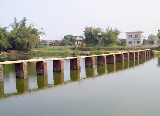 沿著彎彎的鄉(xiāng)間小路,可來到古勞水鄉(xiāng)一處名叫“二渡橋”的地方。只見前面的圍墩上,有幾棵百年老榕,靜靜地鎮(zhèn)守和護衛(wèi)著這一方水土。榕蔭下,幾塊長條花崗巖石條曲曲折折地架在魚塘邊的木樁上,頗有一種“小橋流水人家”的韻味。這種花崗巖石條,當(dāng)?shù)厝朔Q它“條石”或“西樵石”。因水鄉(xiāng)的泥土細(xì)滑,不易滲水,偶爾幾滴小雨,這里便遍地泥濘,行走不便。于是居民們便用這種“條石”沿著小河涌和糖基鋪路,形成了遍布水鄉(xiāng)的石板小橋和石板小路,構(gòu)成一幅獨特的風(fēng)景。