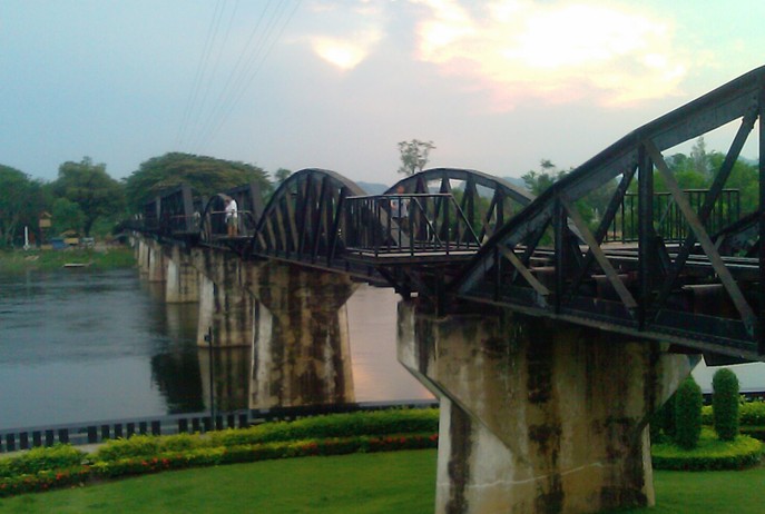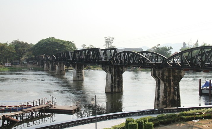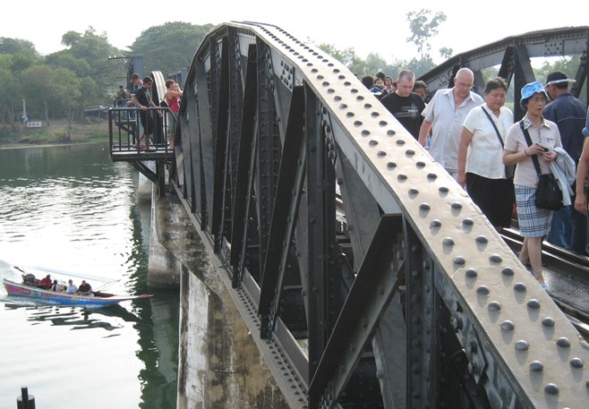 桂河大橋原為木橋,幾經飛機轟炸,早已毀壞,只有在河水很淺時才能看到殘跡,現在我們看到的是后來修建的鐵橋,它今天還在通車。重建后的桂河大橋,在原來橋的兩側圓弧鐵架多出了兩段不協調的方形鐵架,沒有原先圓弧鐵架的優美,很多看過的人覺得不倫不類、不搭調。桂河大橋大約10分鐘就可以走完,過了橋就是一般的死亡鐵路,一直前行可以通到緬甸。站在桂河大橋的橋頭,看著夕陽下靜靜流淌的美麗桂河,使人難以想象這里發生過的悲慘故事,只有安放在橋頭的美軍投下未爆炸的炸彈提示著我們當年那場慘烈的戰爭。