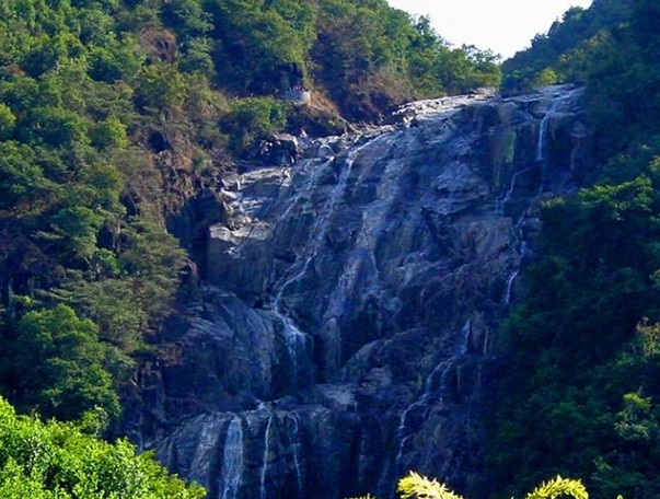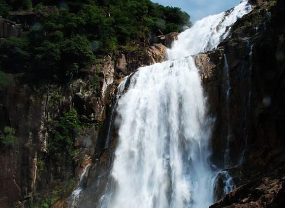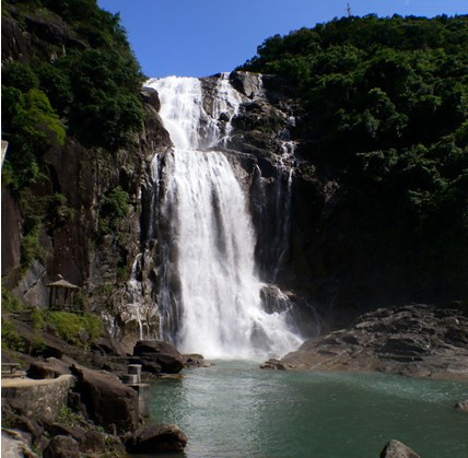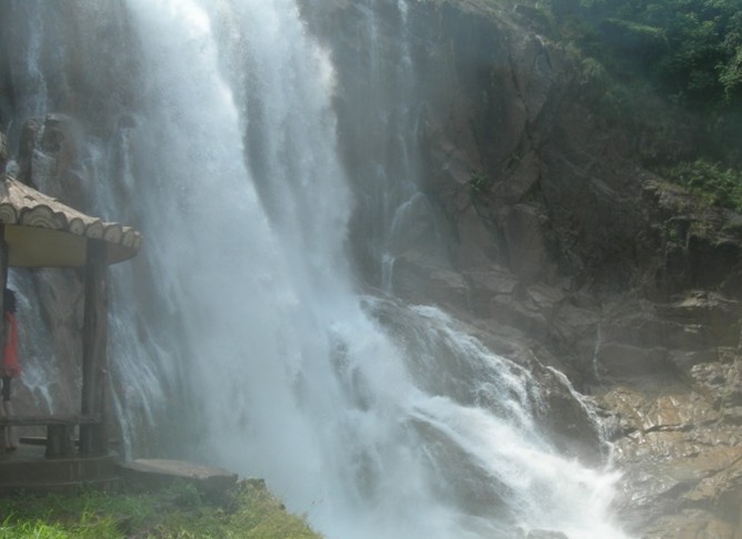 車子在山腳下??亢?,遠遠望去,前面深綠色的山峰上如掛著一幅隱約晃動的瑩亮的素色大綢幅,煞是好看。我懷疑那是不是以前的神仙在洞穴前垂掛的珠簾。我們徒步走在崎嶇蜿蜒的山間小路,朝著瀑布前進。起初聽到的是潺潺的流水聲,越往前進,水聲越大,嘩嘩直響。幾米、十米、幾十米……素色大綢幅越來越大,越來越雄偉,越來越壯觀。那浩浩蕩蕩的流水,如所向披靡的隊伍向著前方沖去。
