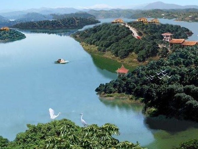 只要登上西湖豪華游艇、飛艇,作環庫游。隨著飛艇在平靜的水面上飛馳,就能看到的是大大小小三百多個庫灣,一個個浮在水面的荔枝孤島,兩邊山上,一片片翠綠茂盛的是荔枝林。