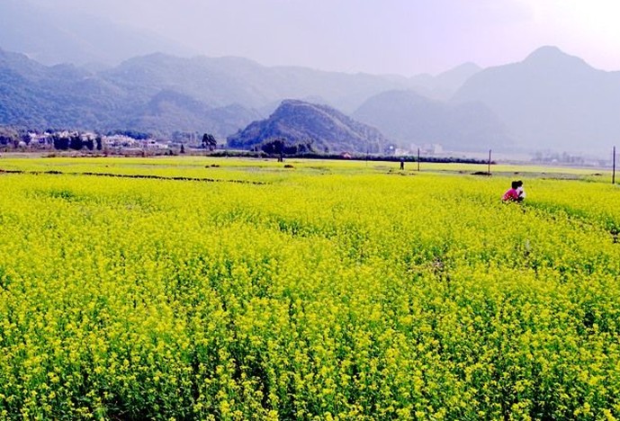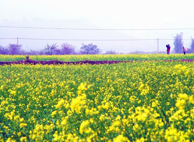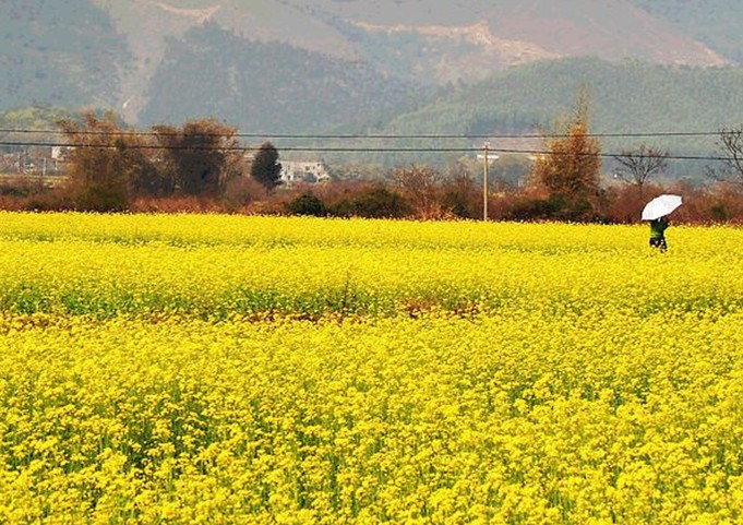 油菜花期,葉少枝繁,虬須互繞,姿豐勢旺。朵朵黃花巧著翠莖,緣下盤上,漸次綻開,撫枝細點,單株菜花均超千朵,體碩株壯者則花數難計。當微吹吹過,花朵輕搖,田野里一望無際的金色花海便仿若一層層的波浪,高低起伏,不斷向游人涌來,百里飄香。
