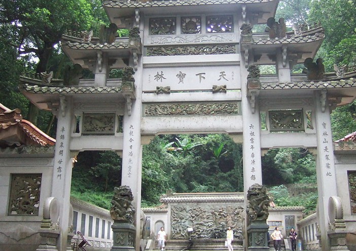 據(jù)明萬歷《曹溪通志》記載:南朝梁武帝天監(jiān)元年,印度高僧菩提達(dá)摩東土弘法,歷經(jīng)三年海上航行,首站登陸嶺南。見此地“山水匯合,峰巒奇秀,嘆如西天寶林山也”,遂建議地方官奏請武帝建寺。天監(jiān)三年(公元504年),寺廟建成,梁武帝賜額“寶林寺”。唐儀鳳二年(公元677年)始,中國佛教禪宗創(chuàng)始人六祖惠能大師來寶林寺說法37載,使南宗禪法大播于天下。故南華寺素有南禪祖庭之稱,還與嵩山少林寺并稱為禪宗祖庭,在東南亞、朝鮮、韓國、日本以及歐美等國家和地區(qū)有重要影響。武則天萬歲通天元年(公元696年),武則天賜慧能水晶缽盂、磨衲袈裟等物。唐神龍?jiān)辏ü?05年),中宗又賜寶缽、磨衲袈裟等物,并將寺名賜改為“中興寺”;神龍三年(公元707年)再改“法泉寺”。宋開寶元年(968),太祖賜額改稱“南華禪寺”,沿稱至今。1983年,南華寺被確定為全國重點(diǎn)寺廟。今南華寺占地總面積約42.5萬平方米,主體建筑群總面積1.2萬平方米。為階梯式中軸線對稱平面布局。寺向?yàn)樽背稀V休S線上由南至北依次為曹溪門(頭山門)、放生池(上筑五香亭)、寶林門(二山門)、天王殿、大雄寶殿、藏經(jīng)閣、靈照塔、祖殿、方丈室。自天王殿始作封閉,東側(cè)依次為鐘樓、客堂、伽藍(lán)殿、齋堂等;西側(cè)依次為鼓樓、祖師殿、功德堂(亦稱西歸堂)、禪堂、僧伽培訓(xùn)班等。主體建筑院落外,北側(cè)有卓錫泉(俗名九龍泉)、伏虎亭、飛錫橋;西側(cè)有無盡庵、海會塔、虛云和尚舍利塔;東側(cè)有中山亭。