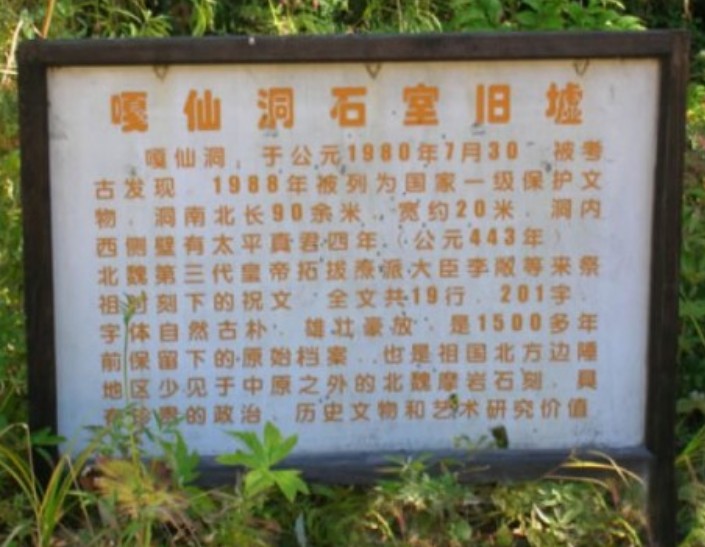 1980年7月30日,人們在嘎仙洞內的斜陽中發現壁上刻有一些道痕,剝掉笞衣,才發現北魏第三代皇帝拓跋燾派中書侍郎李敞,當年祭祖時所刻的祝文。石刻祝文開頭一行有“維太平真君四年癸未七月甘五日”(公元443年)字樣。祝文通篇是歌祖先之功德,乞神靈之賜福。
