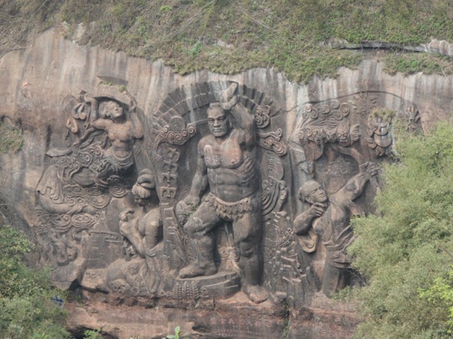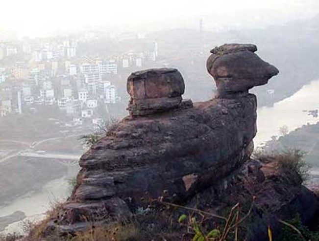在摩崖峭壁上,以《盤(pán)古開(kāi)天地》、《女?huà)z補(bǔ)天》、《后羿射日除獸》組成我國(guó)神話(huà)傳說(shuō)的《華夏魂》,高14米、寬20米的大型摩崖石雕。百步天梯之下,是地勢(shì)隱蔽的狹谷,傳說(shuō)金雞的配偶就選擇這塊地方下蛋,故稱(chēng)蛋谷。母雞把孵出的小雞,一群群地帶往外地安家落戶(hù),繁衍子孫。樂(lè)昌古佛巖的“鷹撲雞群”一景,有人說(shuō)就是它他的后代。登上螺旋梯的頂端,就是“朝陽(yáng)亭”了,何謂朝陽(yáng)亭?就是不論是旭日東升,還是夕陽(yáng)西下,陽(yáng)光總是照射到這個(gè)亭子。
