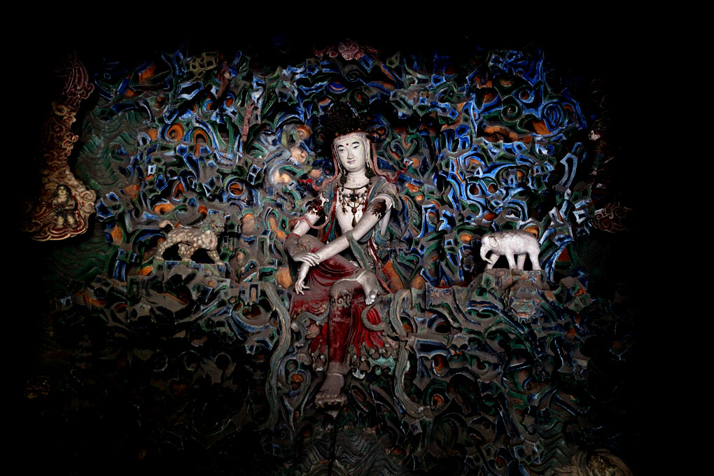 殿內(nèi)正中佛壇上,塑有釋迦牟尼、文殊、普賢、阿難、迦葉像,其中一佛(釋迦牟尼)、二弟子(阿難、迦葉)像為宋代原塑。檐墻及圍繞佛壇的扇面墻上,均繪有明代成化年間繪制的壁畫,題材內(nèi)容為佛傳故事。壁畫色彩艷麗,線條流暢。扇面墻背面塑有玲瓏別致的須彌山,山間塑有羅漢、獅、象等,中部有一尊明代彩塑觀音坐像,頭戴寶冠,肩披瓔珞飄帶,胸臂裸露圓潤,一足踏蓮,一足踞起,雙手撫膝。鼻梁微高,柳葉細眉,面容恬靜安詳,姿態(tài)優(yōu)雅端莊;實為中國古代彩塑杰作。