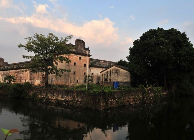 與別的客家圍屋不同,龍?zhí)锸谰尤姝h(huán)水,水面寬約16米,呈半圓形,另一面是高大的圍墻,水面上一座小橋,通往對岸的一個亭子。想來那是當年迎客的接風(fēng)亭,或者是警惕外敵的了望哨所。可見當年的守衛(wèi)十分森嚴。據(jù)介紹,這個半圓形的河岸與外墻成“龜背”狀圖案,為各地圍屋所少見。圍屋四周的花園曲徑通幽,走進花園猶如走進歐洲中世紀的古堡花園,綠樹鮮花散發(fā)出來的芬芳令人陶醉,這是典型的嶺南客家式的地主莊園。