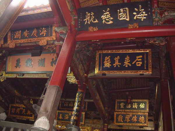 走進臺南大天后宮時,才發現大天后宮那富麗堂皇,威嚴顯赫的氣派,已極盡了宮殿建筑的豪華壯麗。由大門朝里望,透過三進逐次升高的天井和房舍狹長的空間,可以遙見那香煙繚繞、金黃帷幕下的全身媽祖神像。廟宇堂皇壯觀,信徒眾多,香火鼎盛。由于受到歷代官府的整修和保護,大天后宮內文物保存較多。廟中神像佛像也多為名家雕塑,石雕、木雕的柱、窗、梁都有很高藝術價值。還有許多古碑、古匾、古聯等珍貴的文物,據說單單古匾就有200多塊,平時無法全部掛出來。最寶貴的是雍正皇帝所賜的“神昭海表”、咸豐皇帝的“德侔厚載”、光緒皇帝的“與天同功”等御筆匾。由此可見,大天后宮與普通天后宮、普通廟宇相比,簡直就有一個天上、一個地下的感覺。