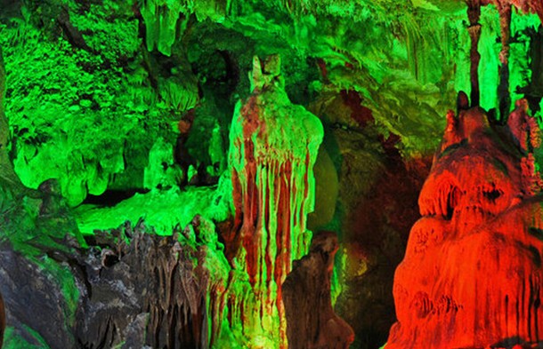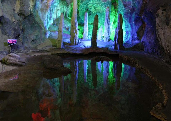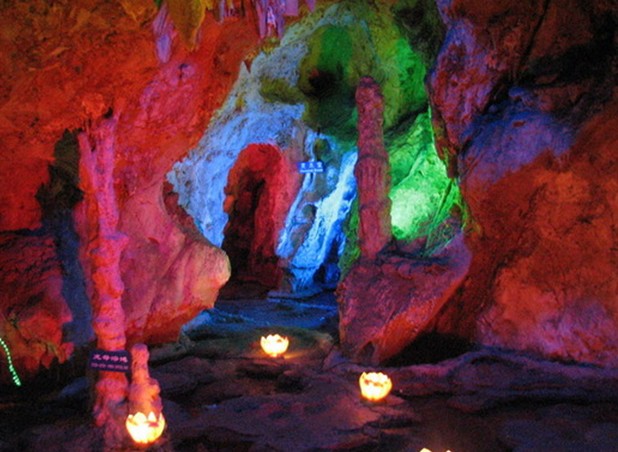 蟠龍洞的特殊景觀有三外:其一是世界三大石花洞之一。洞內(nèi)石花剔透玲瓏,晶瑩如玉,它附著于巖壁之上,不按重力方向生長,版權(quán)所有山東聊城聊之旅國際旅行社有限公司,轉(zhuǎn)載必究!而向四面節(jié)節(jié)開花,見氣成石,繼續(xù)生長,變幻無窮。其二是我國南方典型的大熊貓--劍齒象動物群"古動物化石區(qū)",最為珍貴的是"智人"古人類化石。其三是蟠龍洞尚未開發(fā)的龍泉地下河,河中有泉眼,每隔十分鐘左右,泉眼波浪翻滾,似海潮洶涌,沖刷河岸,隨后又似退潮,靜靜地回流石洞,經(jīng)專家確認為地下間歇泉,是一罕見洞府奇觀。洞長千米,深暗幽邃。里面有高達30米的螺頂,有深不見底的石罅,寬闊空曠處都能容千人,窄處不能2人并行。在洞內(nèi)跺腳砸壁會發(fā)出“嗡嗡”回音,給人一種神秘莫測的感覺。洞口朝南,為券拱門,門上坎刻“龍洞熏風(fēng)”四個篆字,為康熙14年5月立。洞內(nèi)10米處,有一供臺,臺上神像已廢,只剩臺下殘存的幾尊羅漢石像身軀。向洞內(nèi)行至30米處,開始向右下方拐彎,回頭外望,只見洞口猶如月牙出山,人稱“回首望月”。繼續(xù)前行,步步廳景。鐘乳石形成的“火燒葡萄架”含珠點翠;石壁上被浸蝕成的“仙人炕”形體逼真;巨石橫貫的“仙人橋”奇特驚險,世間罕見。再向里進,八戒可見鐘乳石形成的“江豬探海”、“水簾瀑布”、以及多年沖刷而成的“姜池”、“藕池”,池內(nèi)形似鮮姜的鐘乳石如霞似錦。“蓮藕”如雪似玉。“玉龍騰空”尤惹人注目:在高達20米的洞壁上,有一塊鐘乳石,宛若玉龍,通體覆蓋著銀光閃爍的“龍鱗”,妙不可言;龍頭垂下,嘴里噴球吐玉人,人稱“龍滴水”,滴在下面“蓮花盆”里,四時不涸。“鷂子翻身”是洞內(nèi)向下延伸的地方,此處游人不能正面行進,必須翻過身子,雙手攀石倒行;路旁有深不見底的石罅。走過險境,是一段空闊平坦的地帶,版權(quán)所有山東聊城聊之旅國際旅行社有限公司,轉(zhuǎn)載必究!這兒路面干燥,清風(fēng)習(xí)習(xí)。再向里前進,便是“倒爬四十步”,雖然路程難走,卻另有一番意境。再向前行200米,有巨石擋堵,不能前往。洞口外200米處為金代佛隱寺遺址,存戲臺和石碑1通、古柏1株。漫山蒼松翠柏,郁郁蔥蔥;山下溝壑幽深,樹林茂密。