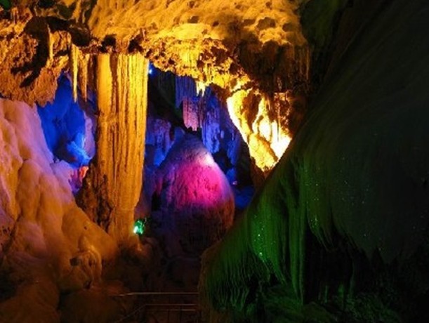 云浮蟠龍洞風(fēng)景名勝區(qū)位于廣東省云浮市區(qū)北部的獅子山中,是一個經(jīng)歷了1.7億多年逐漸形成的次生溶洞。洞分3層,上為天堂通天洞,下為龍泉地下河,中為九龍長廊。蟠龍洞屬喀斯特溶洞,洞內(nèi)石花高懸,鐘乳低垂,石筍石柱如林,石幔、石帳、石盾、石堤應(yīng)有盡有,奇景疊出,洞體迂回曲折,形若蛟龍,故得名"蟠龍洞"。蟠龍洞屬喀斯特溶巖,經(jīng)歷億萬年漫長歲月逐漸形成。洞內(nèi)游程528米,分三層,上層天堂通天洞,下層龍泉地下河,中層九龍長廊,層層相連,曲折迷人。洞內(nèi)鐘乳千姿百態(tài),石筍石柱如林。處處有景,景景皆奇。類人似物有“神龜朝圣”、“龍母浴池”“天書神筆”、“玉壁雄關(guān)”等58景,真是惟妙惟肖,栩栩如生,引人入勝。版權(quán)所有山東聊城聊之旅國際旅行社有限公司,轉(zhuǎn)載必究!而最為奇特的是洞內(nèi)巖壁上長出的簇簇石花,石花晶瑩潔白,剔透玲瓏,如銀星閃爍熠熠生輝。