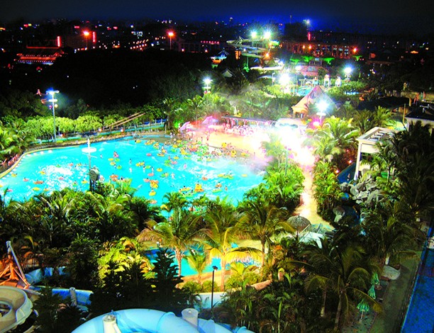 二、濃蔭蔽日、棕櫚搖曳的南國風情使人心曠神怡。 闊別一冬的夢幻水城已經成為一個濃蔭蔽日、棕櫚搖曳的綠色的世界,漂流河、兒童池、滑道以及情侶池等被綠蔭所掩蓋,那些爬藤植物使所有的遮陰棚看起來象一座座涼爽的小屋,使“古老的廊堡”更添滄桑感。在一片綠色的世界下面,潔凈的水汩汩而流,水槍水炮在樹逢里噴射,這是一個真正的清涼世界。