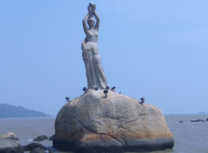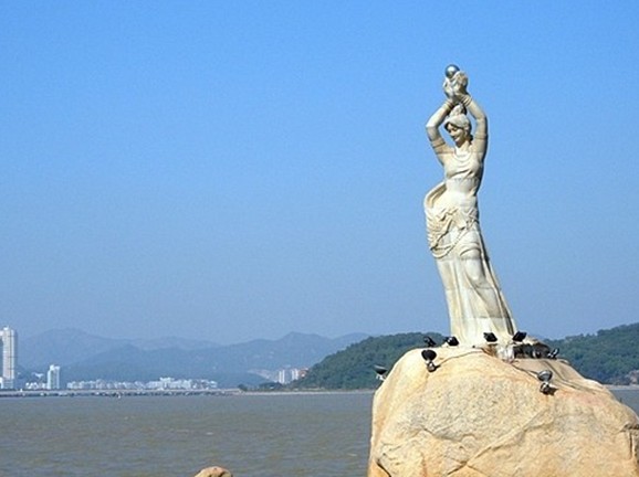 珠海市風(fēng)景秀麗的香爐灣畔,矗立著一尊巨型石雕——珠海漁女,一條美麗整潔的環(huán)海大道——情侶路從她身旁穿過,更使她顯得純潔而大方。她領(lǐng)戴項珠,身掮魚網(wǎng),褲腳輕挽,帶著喜悅而又含羞的神情雙手高高擎舉著一顆晶瑩璀璨的珍珠,獻給德高望重的九洲長老,并向世界昭示著光明,向人類奉獻珍寶。