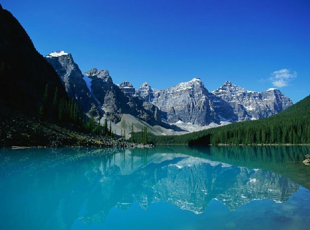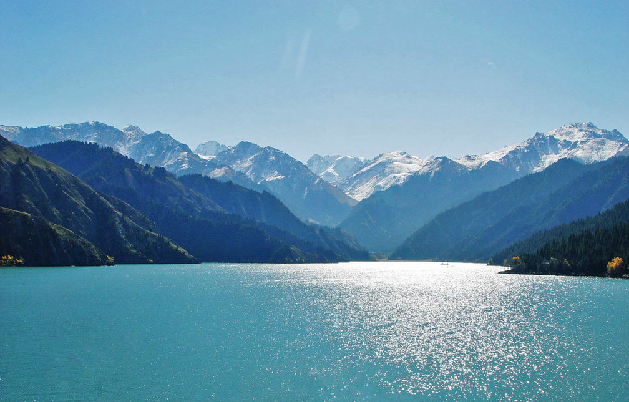 天池東南面就是雄偉的博格達主峰(蒙古語“博格達”,意為靈山、圣山)海拔達5445米。主峰左右又有兩峰相連。抬頭遠眺,三峰并起,突兀插云,狀如筆架。峰頂?shù)谋ǚe雪,閃爍著皚皚銀光,與天池澄碧的湖水相映成趣,構(gòu)成了高山平湖綽約多姿的自然景觀。
