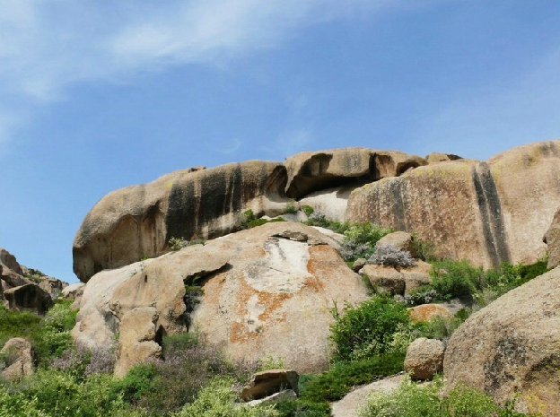 一條國防公路從博樂出發,呈西南--東偏北走向貫穿其中一條較寬山谷--秀女溪谷。進入谷內,有一圓形開闊之處,放眼望去,似用巨石砌成的古堡。版權所有聊城聊之旅國際旅行社有限公司,轉載必究!頂部之石,如炮臺,似望樓;石面之竅,既像獨目嘹望之孔,換個角度,又似天降水滴,故名為“生命之源”。真可謂移步換景!雖處于干旱半干旱地帶,但是怪石峪黃昏后氤氳多云,山谷底有泉流,石石皆有苔蘚,新長者,呈現嫩綠;枯萎者,如涂赭黃;成熟的,似貼黑面。各色相間,布于石上,若古堡斑斕多彩的裝飾,競顯貴者之豪華,王者之氣勢。
