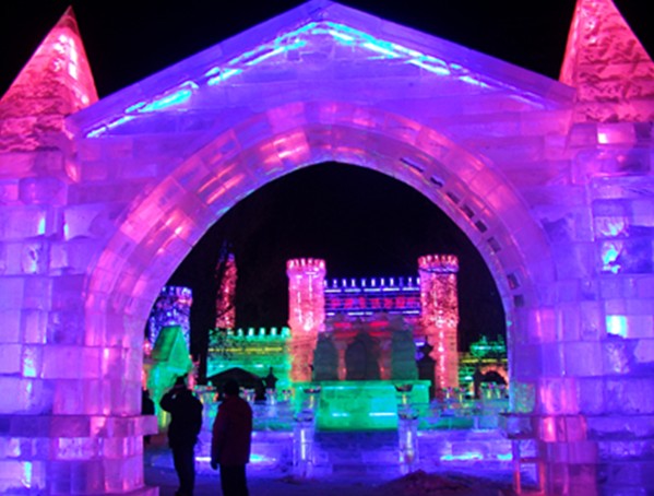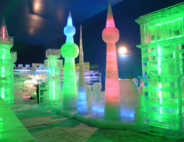 現(xiàn)代獨特的冰質(zhì)造型藝術(shù)與冰景造園藝術(shù),是冰城人開發(fā)利用冰雪資源最為突出的成就之一。它以松花江天然冰、自來水和各種電燈為材料,用砌筑、堆壘、雕刻、噴澆、冷凍和鑲嵌等方法,根據(jù)特定的主題需要和總體布局安排,在不同的園林空間加工出有關(guān)的冰景,冰建筑、冰雕塑、冰 瀑布、冰花壇、冰滑梯、冰書法、冰盆景、冰廣告、冰凍花、冰罩燈,組成若高低錯落、疏密有致的不同景區(qū),形成步步有景、步移景易的冰雪園林,同時配置各種燈光,增加動的成份,輔以音響效果,達(dá)到形、光、動、聲的和諧統(tǒng)一。冰燈藝術(shù)是以冰為載體,以燈為靈魂,融繪畫、雕塑、建筑、園林、文學(xué)、音樂等多種藝術(shù)于一身,并可運用光學(xué)、力學(xué)、聲學(xué)及電氣、機械等科學(xué)技術(shù)的新興的造型藝術(shù)。運用這種藝術(shù)形式創(chuàng)造出的珠宮琳館、瓊榭瑤橋、銀雕玉塑、冰山雪嶺、冰凌冰瀑,白晝間千姿百態(tài),晶瑩剔透,入夜后流光溢彩,萬紫千紅,象撲逆迷離的仙山瓊閣,似如夢如幻的水晶宮闕,且年年出新意,歲歲景不同,被稱為"永不重復(fù)的童話世界"。冰雕,即是冰燈中的一個品種,又是一種獨立的藝術(shù)形式。哈爾濱每屆冰雪節(jié)期間,都要分別組織職工、家庭、少年兒童和全國中學(xué)生以及國際性的冰雕比賽,比賽產(chǎn)生的數(shù)百件作品姿態(tài)各異,生動傳神,巧奪天工。