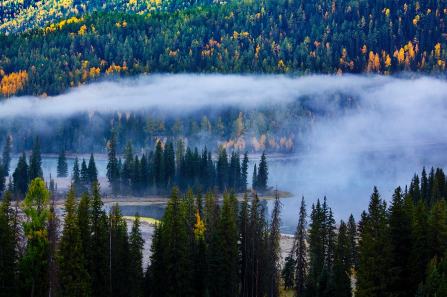 這里的河水將森林和草地分切成一塊塊似連非連的小島,人們稱之為“神仙灣”。它是喀納斯河在山澗低緩處形成的一片沼澤淺灘,從湖面背光處看去,在陽光照射下河水流光溢彩,連樹上的葉子都隨風搖曳、閃閃發光,仿佛無數珍珠任情灑落,為此也被稱為“珍珠灘”。這里常有云霧繚繞,山景,湖水,樹葉相互映襯;綠色的白樺林,湛藍的喀納斯,紅色的小木屋,超凡脫俗,如夢如幻,如臨仙境,神仙灣由此名。