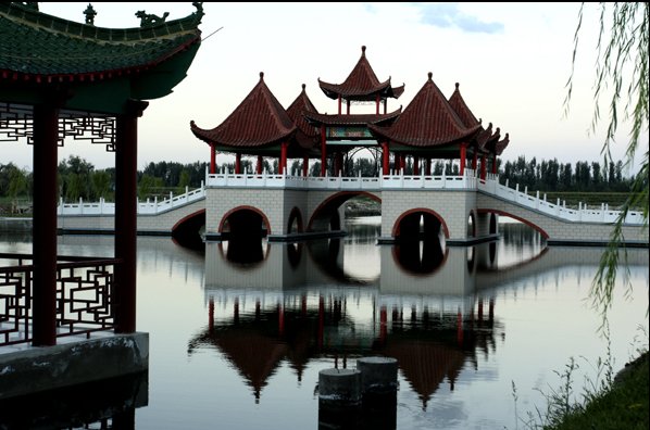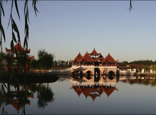 景區(qū)內(nèi)一邊是氣勢(shì)壯闊、一瀉千里的塔里木河,一邊是胡楊環(huán)抱的江南園林建筑。景區(qū)內(nèi)最為注目的是五亭橋,周?chē)づ_(tái)樓閣、曲水環(huán)繞、軒榭廊橋、綠草如茵、啾啾鳥(niǎo)鳴、生機(jī)盎然。具有江南園林風(fēng)格的景區(qū),將亭臺(tái)樓閣組成的建筑群落與人文自然景觀相融合。