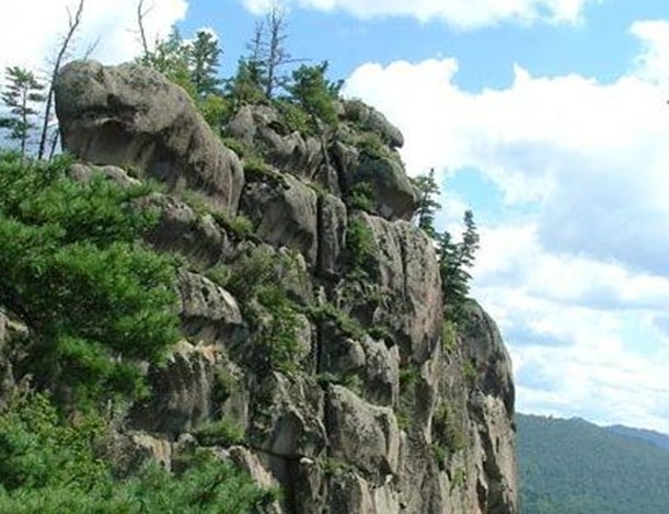 獅面山是一座面如獅頭的山,其鼻、嘴、眉清晰可辨,十分逼真,就好像獅子的面部一樣,它完全是大自然的神來之筆,未經任何人的修磨,栩栩如生,別具風姿。從景區入口踏上365個臺階的云梯階,一步步登向一棵松。365個臺階意味著天天向上,一天一個新臺階的意思。第一個景點為一棵松,登上一棵松頂端,向南可看到小興安嶺最高峰——平頂山俯瞰鄉村面貌和蜿蜒流淌的小河,北望懸羊峰,西觀桃山奇峰,腳下松枝上碩果累累,巖石正中生長著的這棵百年紅松便是“一棵松”,在一棵松周圍還生長著興安杜鵑,山蔥、石花等。清晨登上一棵松,可觀日出林海,雨后登上一棵松,仿佛置身云霧中,此刻,霧從谷底升,云從天邊來,云霧就在您身邊,伸手可摸,這是思權亭。思松亭與一株百年紅松相偎依,微風拂過,松亭錚錚響,游客可坐在亭內邊休息邊賞景。