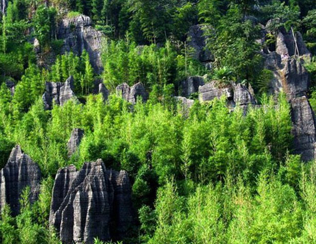 綠色石林地處貴州省貴陽(yáng)市修文縣,占地1000多畝。景區(qū)內(nèi)眾多奇峰怪石拔地而起,似劍如戟,破土直刺蒼穹。石峰最高達(dá)30余米,又有地峽石罅幽深曲折。因綠樹古藤、蟠枝虬根常年攀附石峰,使石林平添了幾許柔情,獲得了“綠色”石林的美譽(yù)。又因它造型迥異的石形而贏得了“擬態(tài)動(dòng)物園”的美名。
