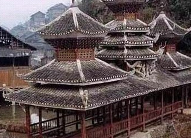 地坪風(fēng)雨樓 這是貴州省最大、造型最美的風(fēng)雨橋。長達(dá)50多米的地坪風(fēng)雨橋始建于清光緒二十年即公元1894年,1959年毀于火災(zāi),1964年重建。整座橋不用一釘一鉚,而運用杠桿力學(xué)原理,將大小不一的柱、枋、檁、凳、欄桿等全部用杉木鑿榫穿枋構(gòu)成。橋體為長廊式木結(jié)構(gòu),橋上有一大兩小共三座橋樓。居中的大橋樓是鼓樓式建筑,兩邊的橋樓皆為三層重檐雙斜面屋頂。