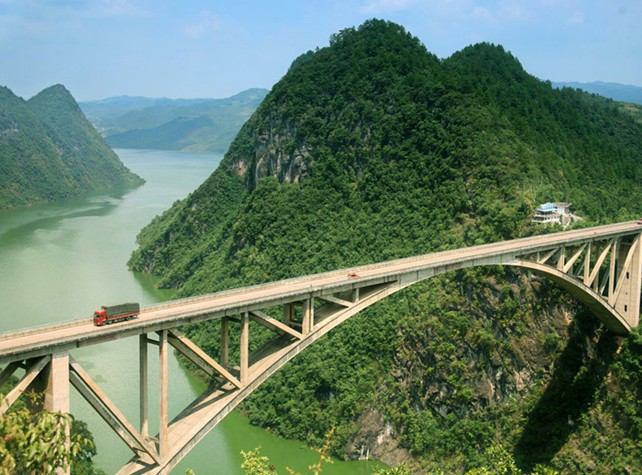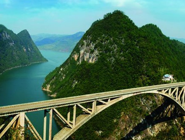 江界河大橋是交通部和貴州省重點科研項目“大跨度桁式組合拱橋研究”課題的依托工程,1995年12月竣工通車。該橋位于甕安縣境內的烏江中游峽谷上,全長461米,主孔跨經330米、寬13.4米,橋面距水面高263米。大橋采用人字桅桿吊機懸拼吊裝架設,其跨度居目前世界同類橋型之首,為世界第一座大跨度桁式組合拱橋,此項技術的研究和應用1996年獲貴州省科技進步一等獎,貴州省第9次優秀工程設計一等獎,1997年度國家科技進步二等獎,1996年和1997年度獲交通部公路工程優質工程一等獎。江界河大橋的建成,不僅溝通了甕安與遵義的公路交通,方便了兩地人民的經濟交往,而且為四川、重慶車輛經貴州入廣西、湖南提供了一條新的捷徑。