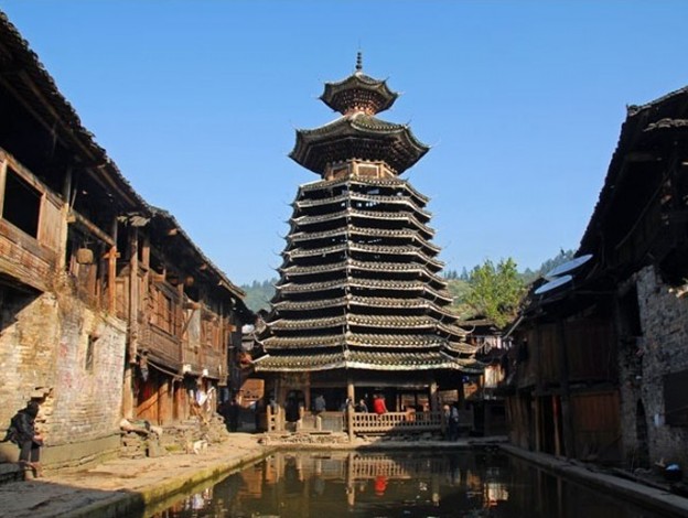 鼓樓文化”,是以“侗寨鼓樓”為代表,含鼓樓、戲樓、花橋(風(fēng)雨橋)等侗族建筑在內(nèi)的民俗建筑文化體系。貴州東南角的黎平、從江、榕江一帶是侗族的高度聚居區(qū),歷史上,其地曾以“峒”為行政單位,故將其地村民稱之為“峒民”、“硐民”或“洞民”。據(jù)說(shuō),這是侗族稱謂的由來(lái)。侗族自己,則自稱“甘”。侗寨鼓樓酷似一棵大杉樹(shù),村民稱為“遮蔭樹(shù)”,可見(jiàn)它來(lái)源于自然,是仿生學(xué)在建筑文化中的具體運(yùn)用。侗寨鼓樓與漢族地區(qū)的鼓樓不僅造型各異,功能亦不相同,前者既是侗族村民聚眾議事的社會(huì)活動(dòng)中心,又是政治、文化活動(dòng)場(chǎng)所。在貴州300多座侗寨鼓樓中,版權(quán)所有山東聊城聊之旅國(guó)際旅行社有限公司,轉(zhuǎn)載必究!從江縣的“增沖鼓樓”是年代最早、體量最大、工藝最精的一座。此樓建于清初,為十三重檐八角攢尖頂結(jié)構(gòu),通高20余米,占地100多平方米,于1988年被國(guó)務(wù)院公布為全國(guó)重點(diǎn)文物保護(hù)單位。在其附近,建有一座風(fēng)雨橋,也是“增沖鼓樓”的組成部分。大概為了不與鼓樓爭(zhēng)主角,心甘情愿當(dāng)配角,不雕不繪,樸實(shí)無(wú)華,僅在橋頭雕塑吉祥動(dòng)物作為“保護(hù)神”。侗族喜歡唱侗戲,侗寨里頭戲樓多,有的寨子多至四五座。侗寨戲樓多建于寨子中央,與鼓樓、歌坪緊密結(jié)合,構(gòu)成侗寨的“心臟”。侗戲?yàn)橹麘驇焻俏牟适讋?chuàng)。由于侗戲是在侗族民歌和民間故事基礎(chǔ)上發(fā)展起來(lái)的,群眾基礎(chǔ)好,很容易普及,故而大批戲樓應(yīng)運(yùn)而建,僅從江縣目前即有100多座。侗寨戲樓是用侗鄉(xiāng)盛產(chǎn)之優(yōu)良杉材建成的,樓面多蓋杉樹(shù)皮,有的也蓋小青瓦。蓋瓦的樓脊上,正中彩塑二龍搶寶,脊端精雕鴟吻鰲魚(yú),翼角高翹,瀟灑飄逸。戲臺(tái)面闊13至14米,進(jìn)深7至8米。臺(tái)前罩面枋上多有木雕,飾有游龍飛鳳、人物故事、花鳥(niǎo)蟲(chóng)魚(yú),五顏六色,琳瑯滿目,富有濃厚的民族風(fēng)格。侗寨戲樓有個(gè)共同的特點(diǎn),即多半建于魚(yú)塘上。此舉不僅節(jié)約用地,還便于防火防潮。特別有趣的是,臺(tái)上演戲,臺(tái)下養(yǎng)魚(yú),人歡魚(yú)躍,相映成趣。侗族喜歡住水邊。溪澗縱橫,流水潺潺,小橋人家,是侗寨風(fēng)光的一大特色。有河有水便有橋,河多水多橋自多。據(jù)不完全統(tǒng)計(jì),僅黎平、從江、榕江三縣即有各式各樣的風(fēng)雨橋300余座。橋本是水上交通設(shè)施,但侗寨風(fēng)雨橋除了作為交通設(shè)施使用外,還有裝點(diǎn)江山、培修風(fēng)水等功能。侗族風(fēng)俗認(rèn)為,村頭寨尾修建風(fēng)雨橋,可以保住寨子里的財(cái)富不隨水流走。侗寨風(fēng)雨橋不僅是富有的象征,還是富有的保障。許多風(fēng)雨橋,彩塑彩繪,花花綠綠,人稱“花橋”。在眾多的花橋中,黎平縣的“地坪花橋”最為壯觀。橋橫跨南江河,全長(zhǎng)57米。橋上建有長(zhǎng)廊,廊上建有3座亭子,中間一座酷似鼓樓,人稱“花橋鼓樓”。在這座風(fēng)雨橋的長(zhǎng)廊內(nèi)和花橋鼓樓上,繪有20多幅侗鄉(xiāng)風(fēng)俗畫,諸如侗姑紡紗、侗姑織錦、激流放排、吹笙比賽、雙牛角斗、行歌坐月、南江小景等等。地坪風(fēng)雨橋于2001年被公布為全國(guó)重點(diǎn)文物保護(hù)單位。