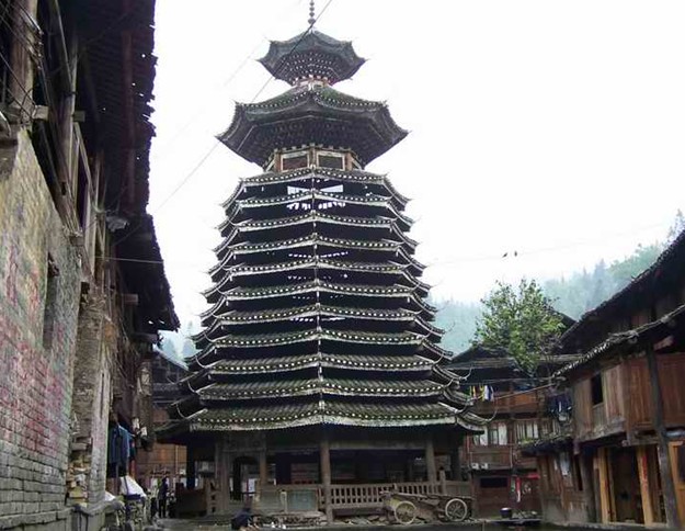 鼓樓在侗族人民的生活中起著重要的作用,它既是侗家集會(huì)議事的政治中心,又是人們拜祭、休息和進(jìn)行娛樂(lè)活動(dòng)的場(chǎng)所,它還是寨老處理糾紛、明斷是非的公堂。當(dāng)遇到緊急情況時(shí),它又成了擊鼓聚眾的指揮所。此外,它還是寨中的青年男女相互交往、談情說(shuō)愛(ài)的地方。凡是侗族人民聚居的地方,幾乎都有鼓樓,它已經(jīng)成為侗家村寨的重要標(biāo)志。