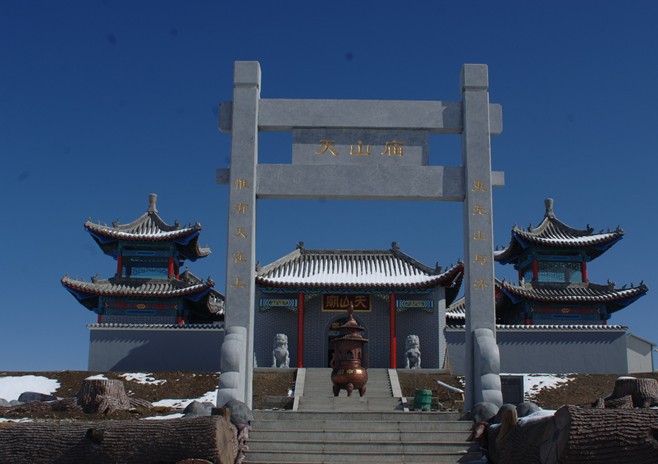 最為貼切地道出了此廟的歷史地位和特點。這一帶為高山草甸夏牧場,站在山頂遠眺,盤山公路、鳴沙山、巴里坤草原盡收眼底,美不勝收。天山廟是位于海拔近3000米的天山之巔唯一的一座廟宇,地勢孤高,氣候瞬息萬變,六月下雪是平常事。在天山廟俯瞰天山九曲十八彎的盤山道,郁郁蔥蔥的松林、潔白的雪山、碧綠的草原、裊裊的炊煙,盡收眼底,心曠神怡。