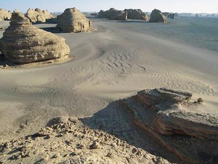 現在的在若羌縣境內東北部,位于塔里木盆地東部。曾是我國的一個湖泊,海拔780m,面積約2400~3000k㎡,因地處塔里木盆地東部的古“絲綢之路”要沖而著稱于世。自20世紀初瑞典探險家斯文•赫定首次進入羅布泊,它才逐漸為人所知。現在羅布泊是位于北面最低、并且最大的一個洼地,曾經是塔里木盆地的積水中心,古代發源于天山、昆侖山和阿爾金山的流域,源源注入羅布洼地形成湖泊。注入羅布泊的諸水,主要有:塔里木河、孔雀河、車爾臣河和米蘭河等,同時也部分的受到來自敦煌的祁連山冰川融水疏勒河的補給,融水從東南通過疏勒河流入湖中。那里曾經是牛馬成群、綠林環繞、河流清澈的生命綠洲。現已成為一望無際的戈壁灘,沒有一棵草,一條溪,夏季氣溫高達71℃。天空不見一只鳥,沒有任何飛禽敢穿越,只是一片沙漠。
