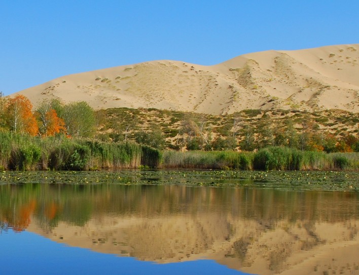 白沙湖,湖面只有0.5平方公里。是個獨立于浩瀚沙漠中的原生態沙漠湖,沒有進水與出水口,沙漠里一般蒸發量都比較大,但這里的水位多年來卻沒有變化,更不因季節變遷而增多或減少。景致構成十分獨特,湖中四周生長著高達1—4米的密密叢生的蘆葦、菖蒲等水生植物,湖中還有野荷花孤寂地生存著;湖周50米內,是高大茂密的楊樹、白樺混生的林帶。