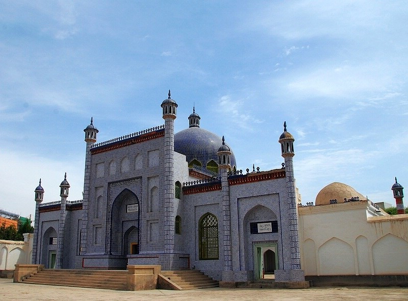 禮拜殿為平頂,主墓室是綠琉璃圓頂;而且其東部建筑中所用塔樓(邦克樓)甚多,約10余座,為新疆同類建筑中少見;塔樓的制作精美可觀,也是建筑裝飾。整個建筑群高低相間,主次分明,形成一完整的群體。墓室外墻以藍底白花琉璃磚貼面,禮拜殿木柱的雕刻花紋古拙奇特,紋樣豐美,與一般制作方法不同,都是新疆伊斯蘭建筑中難得的精品,為后世所罕見,體現出古代維吾爾工匠的高超技藝和杰出才能.
